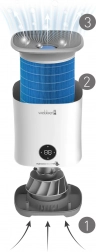 Usisavanje suhog zraka, obogaćivanje mikročesticama vode kroz filtar i 360° distribucija nevidljive maglice po cijeloj prostoriji.