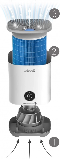 Zahvaljujući sustavu HydroClean CLUSTER ovlaživanje se odvija u 3 koraka: usisavanje suhog zraka, njegovo obogaćivanje mikročesticama vode kroz poseban filtar te 360° distribucija nevidljive maglice u prostor. Antibakterijski filtar SilverNano zajedno s ionizacijom pomaže u smanjenju bakterija, virusa, peludi i prašine, pa je uređaj odličan izbor za alergičare.