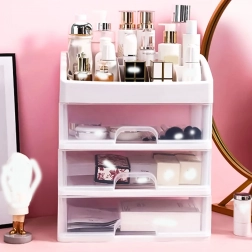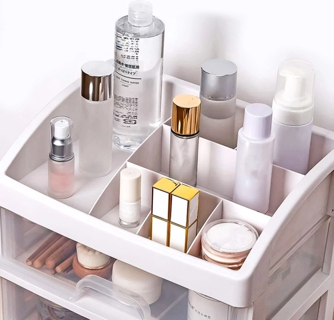 Prostrane ladice pružaju dodatno mjesto za pohranu veće kozmetike, poput pudera, paleta sjenila ili kistova. Ladice su prozirne, što olakšava prepoznavanje sadržaja.