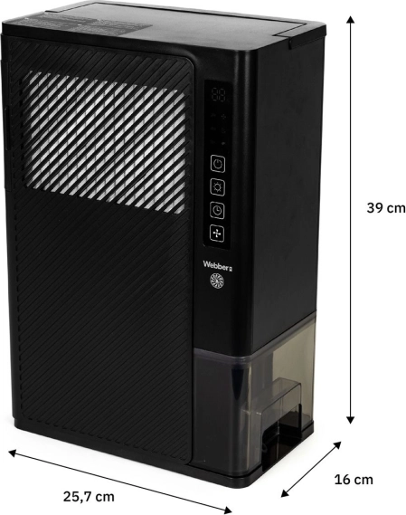 Kompaktan i snažan odvlaživač WEBBER poboljšava klimu u domu i uredu. Zahvaljujući tehnologiji ROTOR DISC učinkovito radi i na hladnoći 0–15 °C, uklanja do 3 l vode dnevno i nudi tihi noćni način rada ≤ 41 dB. Upravljanje je jednostavno preko dodirne ploče i pametne kontrole vlage/zraka True Lumos. Tu su i timer, 2 brzine ventilatora, automatsko isključivanje pri punom spremniku, zaštita od prevrtanja i perivi filter.
