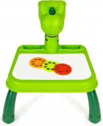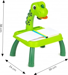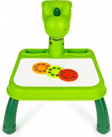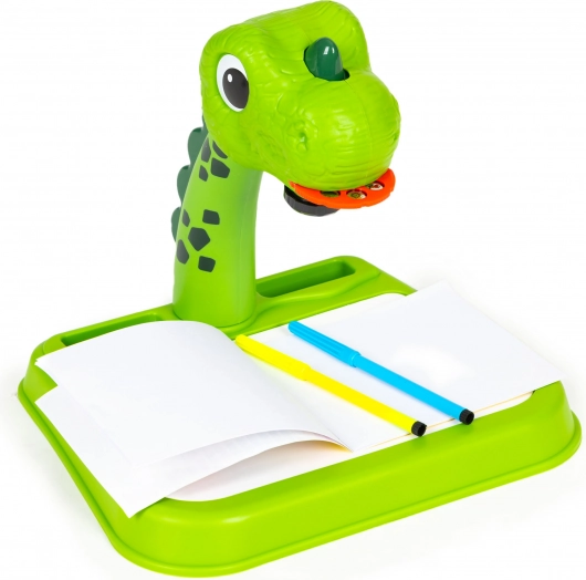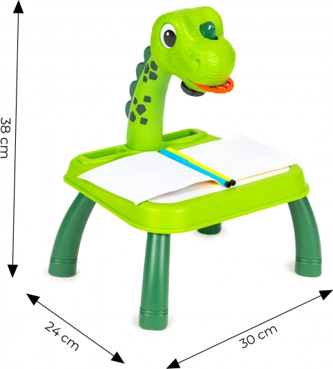 Otkrijte čaroliju stvaranja s dječjim projekcijskim stolićem s dinosaurovim motivom. Dovoljno je umetnuti odabrani disk (životinje, vozila, voće), izabrati motiv i projicirati ga na radnu ploču ili papir – djeca mogu udobno precrtavati i učiti crtati nove oblike. Promjena slike je jednostavna: samo okrenite kotačić i odmah je spreman sljedeći motiv.