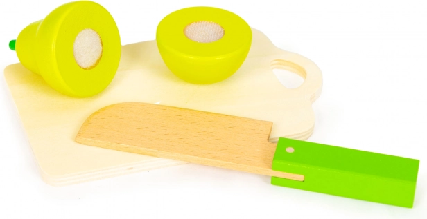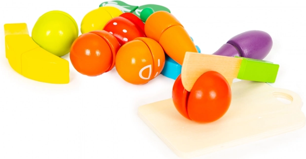 Dijelovi voća i povrća spajaju se na čičak, pa rezanje na dasci zvuči i djeluje realistično. Djeca sigurno iskušavaju kuharske vještine i razvijaju maštu.