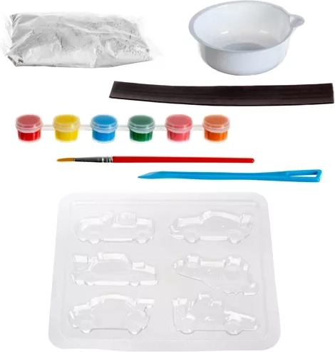 Paket sadrži kalup, gips, 6 boja, kist, posudicu, špatulu i magnete – ne morate ništa dodatno kupovati. Idealan poklon za male stvaraoce.