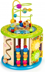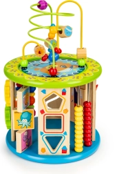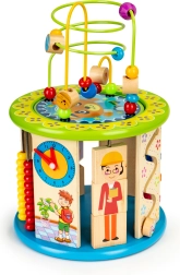 Ova obrazovna kocka ECOTOYS donosi mnogo funkcija u jednome. Uklonjivi poklopac s žičanim labirintom i perlama razvija koordinaciju oko–ruka, bočne strane s sorterom oblika, rotirajućim elementima i pokretnim zupčanicima potiču logičko razmišljanje i manualne vještine. Zahvaljujući drvenoj izradi igračka je stabilna, izdržljiva i ugodna na dodir.