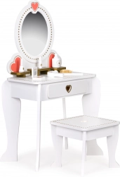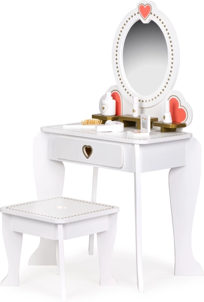 Toaletni stolić s velikim zrcalom i dekorativnim okvirom s uzorcima srdašca savršen je za ulogu male princeze ili vizažistice. Konstrukcija je sigurna i osigurava dovoljno prostora za igranje maštovitih igara.