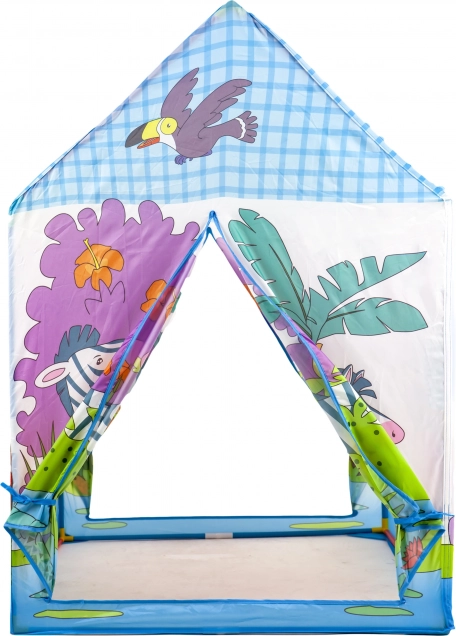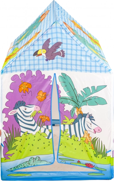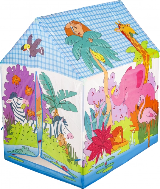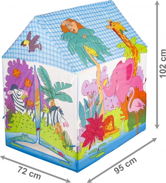 Šator-kućica s šarenim ilustracijama džungle i životinja (slon, žirafa, zebra i dr.) razveselit će svakog malog istraživača. Zahvaljujući laganoj plastičnoj konstrukciji i izdržljivom poliesterskom pokrovu idealan je za igru u dječjoj sobi, na terasi ili u vrtu.