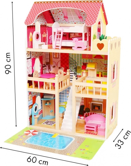 Velika drvena kućica za lutke ECOTOYS nudi 3 kata i 6 prostorija, LED osvjetljenje za čarobnu atmosferu i 16 komada drvenog namještaja. Stabilna i sigurna konstrukcija idealna je za djecu od 3 godine, potiče maštu, kreativnost i finu motoriku. U kompletu je i podloga za igru s motivom bazena za još zabavniju igru.