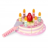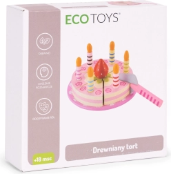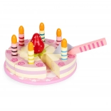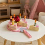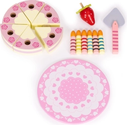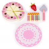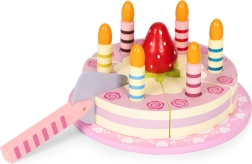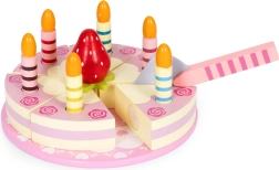 Sadržaj seta: okrugla torta podijeljena na kriške, 6 prugastih svjećica, drvena jagoda, lopatica za posluživanje i ukrasni tanjur. Sve je izrađeno od drveta i obojeno bojama sigurnima za djecu. Set potiče ulogu/rolne igre, trenira koordinaciju oko–ruka i uči djecu dijeljenju i posluživanju gostiju.