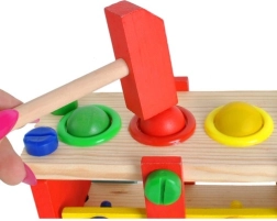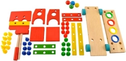 Igračka sadrži razne dijelove za samostalno sastavljanje i rastavljanje, uključujući drvene kuglice, odvijač i čekić.