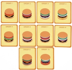 Dio seta je 10 kartica narudžbi koje prikazuju redoslijed pojedinih sastojaka. Djeca mogu slagati burger prema karticama ili stvarati vlastite kombinacije – razvijaju tako kreativnost i logičko razmišljanje. Idealno za samostalnu igru i zajedničku zabavu s roditeljima.