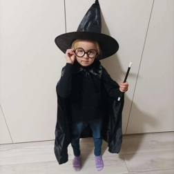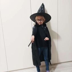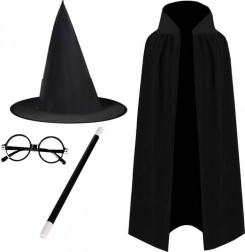 Kompletan čarobnjački kostim za djecu u trenu pretvara malog ljubitelja magije u čarobnjaka. Set sadrži dugi crni plašt s ovratnikom, visoki šiljasti šešir, okrugle naočale bez stakala i klasični čarobnjački štapić. Idealan za Halloween, maškare i kućne čarobnjačke nastupe.