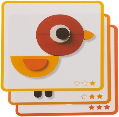 Otkrijte čaroliju učenja kroz igru. Ova drvena slagalica spaja geometrijske oblike i žive boje kako bi djeca lako stvarala životinjske motive prema priloženim predlošcima. Kartice su označene zvjezdicama i vode djecu korak po korak kroz tri razine težine.