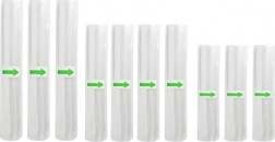 Spremno za trenutačnu upotrebu: 9 rola folije, 5 velikih vrećica, crijevo za izvlačenje zraka, čep za boce i praktičan rezač.