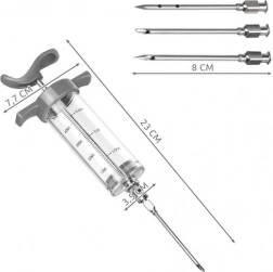 Ova kuhinjska injekcijska štrcaljka idealna je za domaće dimljenje, pečenje i roštiljanje. Omogućuje ubrizgavanje salamure, temeljaca i marinada izravno u mišićna vlakna, što značajno skraćuje vrijeme mariniranja i osigurava ravnomjerno soljenje i začinjavanje. Prozirno tijelo s oznakama u ml olakšava precizno doziranje.