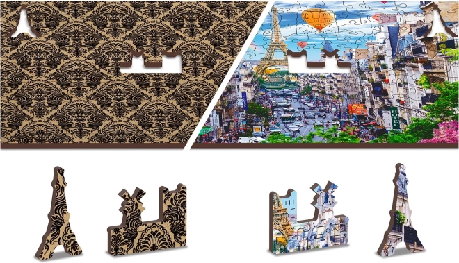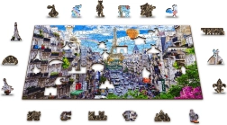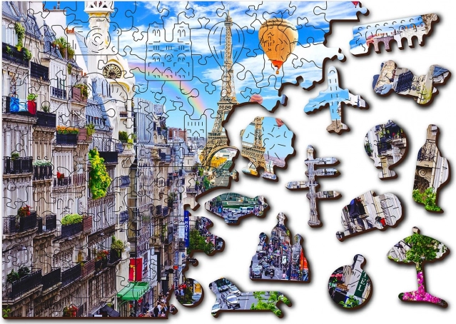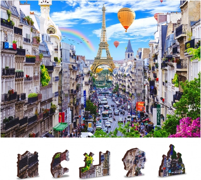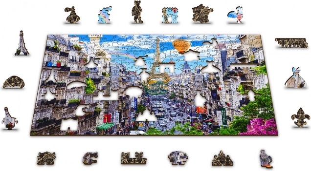 Drvene puzzle Užurbani Pariz od WOODEN CITY su jedinstvene po svojoj dvostranoj konstrukciji i posebno oblikovanim dijelovima koji oživljavaju scenu. Slaganje je zahtjevnije zbog različitih oblika dijelova, ali ujedno zabavnije. Predstavlja izazov i za iskusne ljubitelje slagalica.