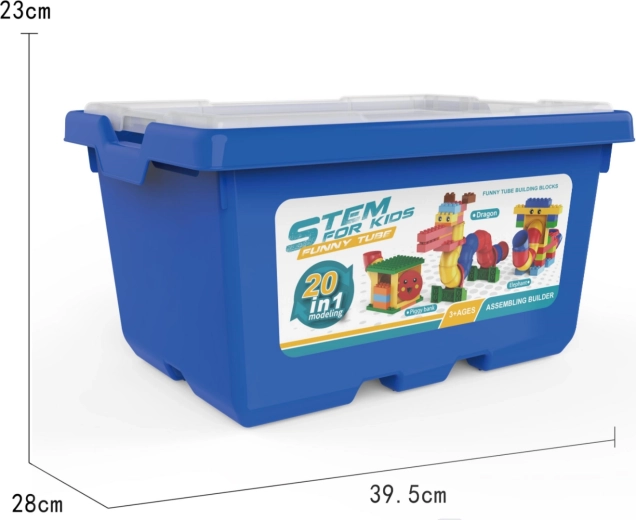 Ovaj šareni konstruktorski set u čvrstoj kutiji izvrstan je početak za male graditelje. Veliki dijelovi, cijevi i zakrivljeni elementi omogućuju slaganje životinja, vozila ili jednostavnih robota te razvijaju maštu i koordinaciju oko–ruka. Praktična kutija olakšava prenošenje i spremanje svih dijelova.