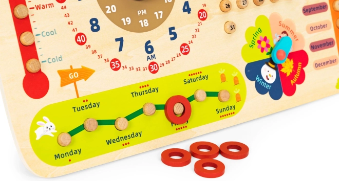 Zahvaljujući malim crvenim drvenim kolutićima, djeca mogu označavati aktualni dan, mjesec, važan datum ili vremenske prilike, čime učenje postaje zabavnije i zanimljivije.