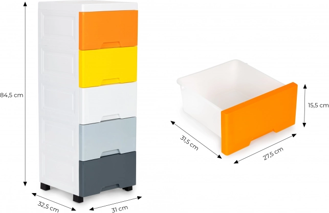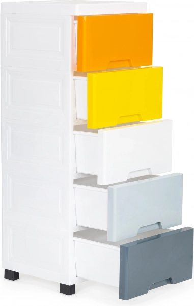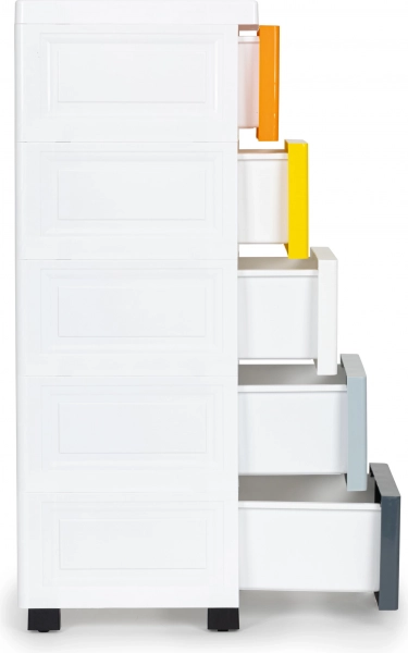 Pet prostranih ladica u različitim bojama olakšava razvrstavanje i brzu orijentaciju. Prednje ergonomske ručke omogućuju glatko izvlačenje i uvlačenje.