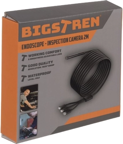 Kompaktna endoskopska kamera BIGSTREN za telefone nudi Full HD (1920×1080) sliku, 2 m polutvrdi kabel, 8 podesivih LED dioda i izmjenjive nastavke (kukica, magnet, zrcalce). Zahvaljujući vodootpornosti IP67 i širokoj kompatibilnosti s Androidom i iOS‑om putem aplikacije ANESOK, lako ćete pregledati cijevi, motorni prostor i teško dostupna mjesta.