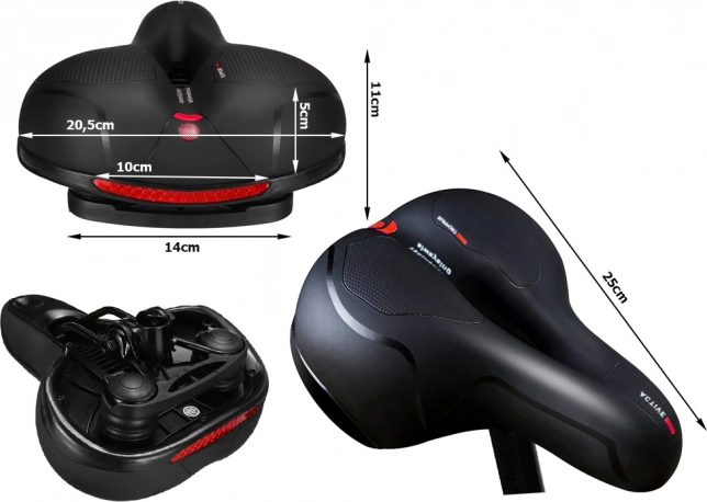 Biciklističko sjedalo dizajnirano je za pružanje maksimalne udobnosti tijekom vožnje zahvaljujući svojoj mekanoj podlozi, koja učinkovito ublažava udarce i smanjuje pritisak na zdjelične kosti. Idealno za duže vožnje.