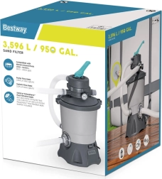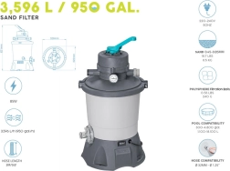 Zahvaljujući kapacitetu 3596 l/h, pumpa je idealna za bazene zapremnine od 1 100 do 18 100 litara. Za rad je potrebna pješčana ispuna (kvarcni pijesak #20, granulacija 0,45–0,85 mm, približno 8,5 kg) ili visokoučinkovite filtracijske kuglice Polysphere™ mase oko 240 g.