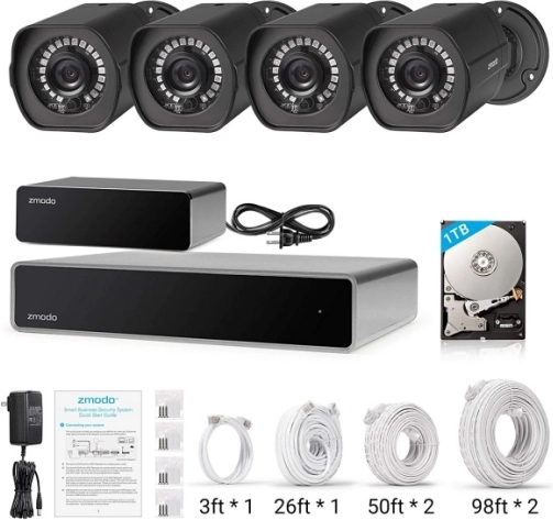 Instalacija je jednostavna i bez stručnih znanja: priključite snimač, repeater i kamere – sustav automatski počinje snimati. Pristup prijenosu uživo i snimkama moguć je putem aplikacije Zmodo (Android/iOS), Windows aplikacije Zviewer, web usluge Zmodo ili izravno preko HDMI-ja na monitoru. Kamere s IR LED i IR-cut filtrom osiguravaju jasnu sliku danju i noću do oko 20 m. Metalno kućište s IP65 zaštitom idealno je za interijer i eksterijer.