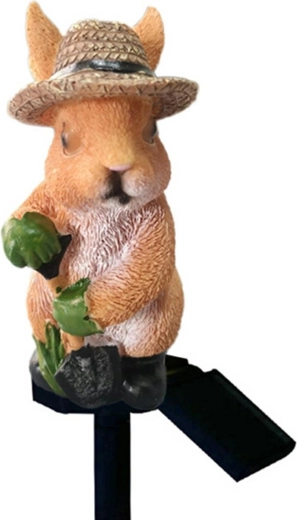 Nesvakidašnja solarna vrtna LED lampa u obliku zeca s cilindrom. Savršen dekorativni element. Lampa se napaja solarnom energijom koja putem solarnog panela puni ugrađenu bateriju. Uređaj se automatski uključuje kad padne mrak (opremljen je senzorom sumraka), a potpuno punjenje baterije omogućuje do 8 sati neprekidnog rada. Lampa je opremljena LED diodom koja emitira bijelo svjetlo. Snažan vršni kolac omogućuje sigurno i brzo učvršćivanje lampe u tlo, dok vodootporno kućište jamči bezbrižno korištenje bez obzira na vremenske uvjete.