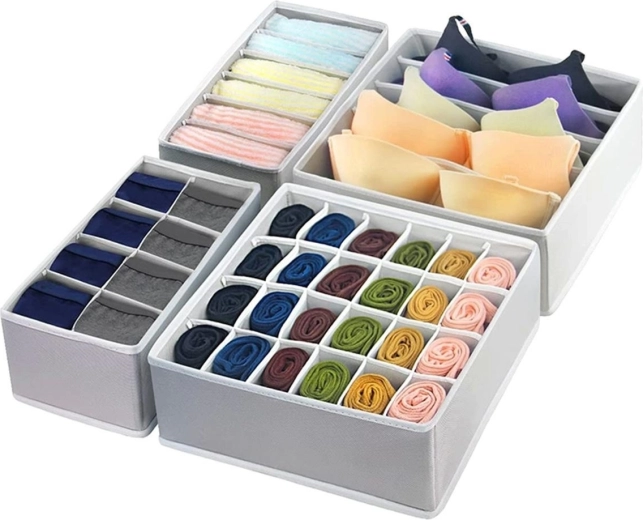 Set od 4 organizatora za ladice. Umetci omogućuju jednostavno, praktično i povoljno organiziranje kolekcija kravata, čarapa, remena i donjeg rublja. Set sadrži tri organizatora različitih veličina, broja pretinaca i namjene. Izrađeni su od izdržljivog, prozračnog materijala. Otvorena konstrukcija omogućuje brz pristup odjeći. Zahvaljujući mogućnosti sklapanja uštedjet ćete dodatni prostor kada trenutno ne koristite nijedan od umetaka.