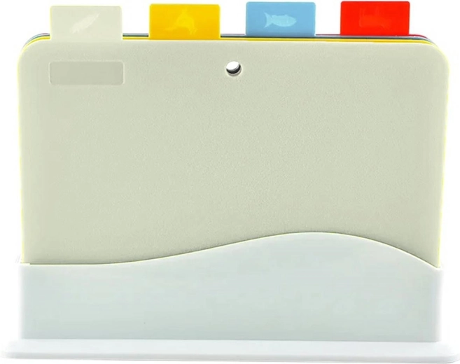 Set od četiri šarene daske za rezanje s namjenskim stalkom. Različite boje olakšavaju njihovo dodjeljivanje određenoj vrsti namirnica i sprječavaju prijenos bakterija među njima. Svaka daska dodatno ima piktogram koji označava za što je namijenjena.