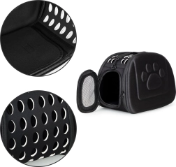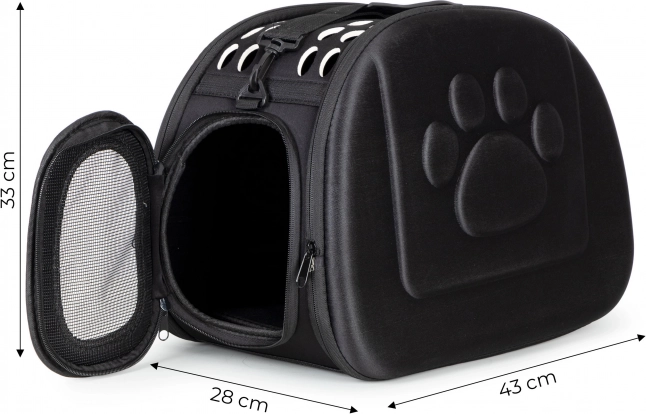 Transporter je opremljen ergonomskom ručkom i uklonjivim podesivim remenom, koji olakšavaju nošenje. Zahvaljujući mogućnosti otvaranja s obje strane, osiguran je lak pristup ljubimcu i čišćenju transportera. Ventilacijski otvori pružaju dovoljan dotok zraka i udobnost tijekom prijevoza.