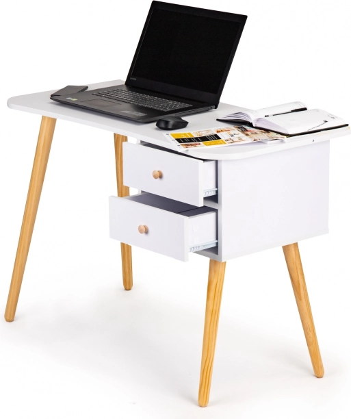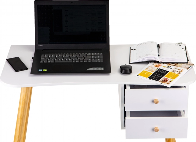 Stilski stol ModernHome ističe se minimalističkim skandinavskim dizajnom koji se savršeno uklapa u moderne interijere. Borove noge u prirodnom dekoru skladno se nadopunjuju s bijelom pločom i osiguravaju čvrstoću i stabilnost. Praktične dvoje ladice drže dokumente, bilježnice i sitnice uvijek pri ruci.