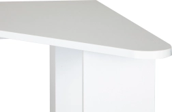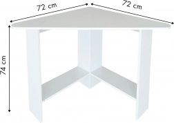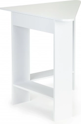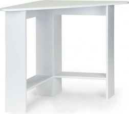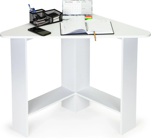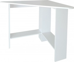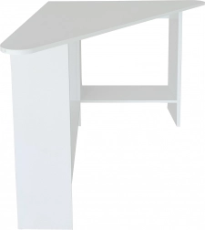 Moderni kutni stol idealan je izbor za manje prostore, gdje je svaki centimetar važan. Trokutasta konstrukcija lako se umeće u kut i stvara stabilnu radnu površinu čistih linija. Ploča i police izrađene su od izdržljive laminirane iverice koja se lako održava i djeluje elegantno.