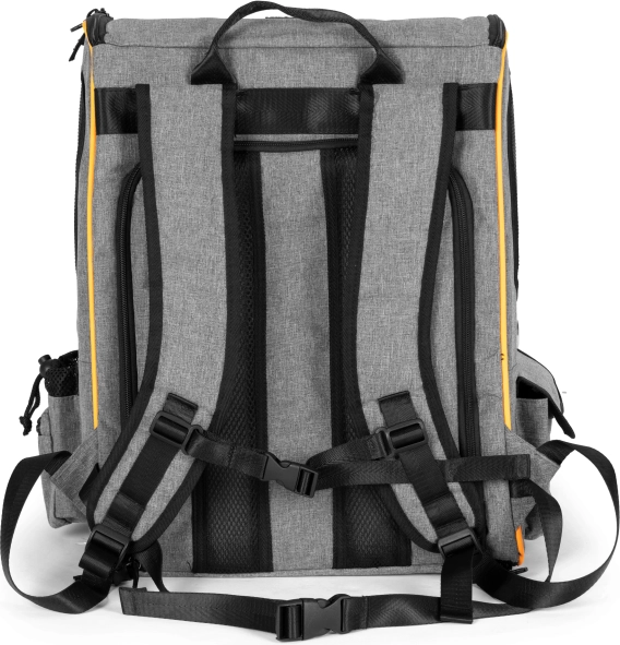 Za udobno nošenje tu su široke podstavljene naramenice uz prsni i lumbalni remen za stabilnost. Unutra je mekana podloga i sigurnosna karabiner kopča za ogrlicu. Bočni džepovi primaju povodac, poslastice ili vrećice – jedan džep ima praktičan otvor za lako izvlačenje vrećica.