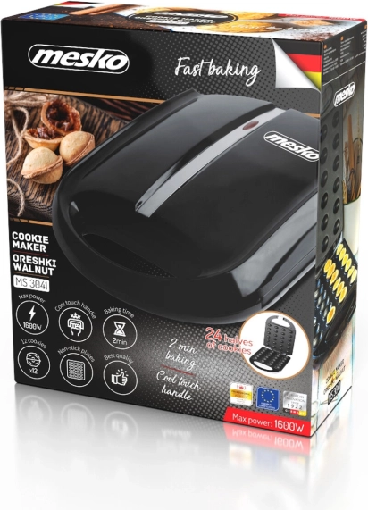 Domaći orašasti kolačići s kremom za 2 minute? S aparatom MESKO XL možete kad god poželite. Velika površina za pečenje u jednom ciklusu stvara 24 velike polovice koje lako spojite u punjene „oraščiće” – slatke ili slane. Neljepljive ploče omogućuju čisto vađenje i brzo čišćenje.