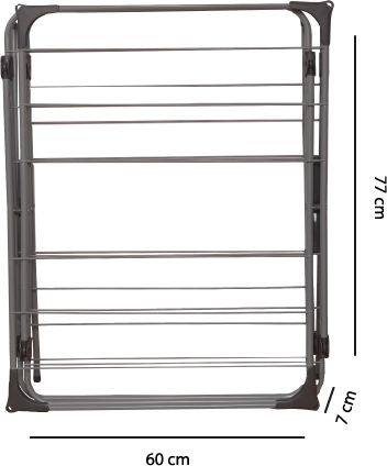 Konstrukcija od čelika s praškastim premazom lagana je, a istovremeno čvrsta; plastični spojevi i metalne zakovice povećavaju izdržljivost pri svakodnevnoj uporabi. Protuklizne nožice osiguravaju stabilnost i na glatkim podlogama, a zasuni protiv samosklapanja pružaju sigurnu upotrebu. Nakon korištenja sušilo jednostavno sklopite za 15 sekundi – zahvaljujući kompaktnim dimenzijama nakon sklapanja stane u ormar ili ostavu.
