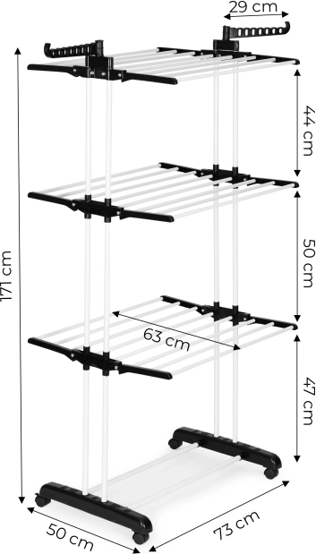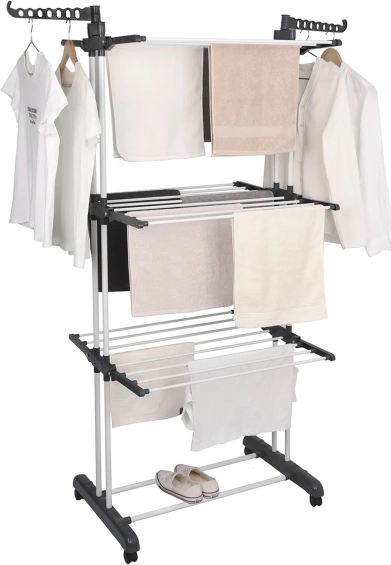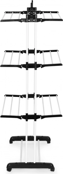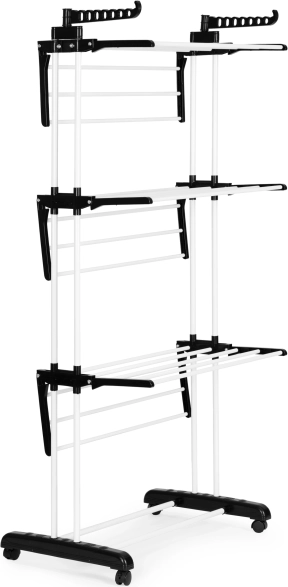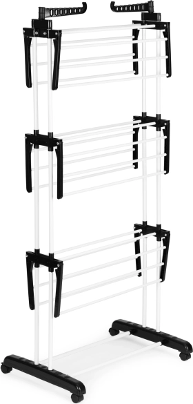 Tri razine sa 6 preklopnih krakova i 2 držača za vješalice primaju veliku količinu rublja, a da pritom ne zauzimaju prostor u sobi.