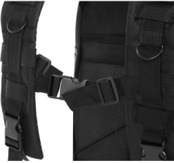 Nosivi sustav s profiliranim naramenicama i brzootpusnim kopčama omogućuje trenutno skidanje ruksaka. Prsna i odvojiva lumbalna traka stabiliziraju teret i štite leđa, dok kompresijske trake drže sadržaj čvrsto na mjestu. PALS trake kompatibilne su sa MOLLE sustavom za pričvršćivanje dodatnih torbica i opreme.
