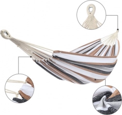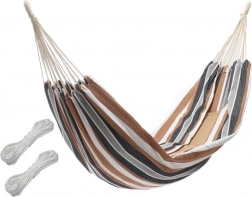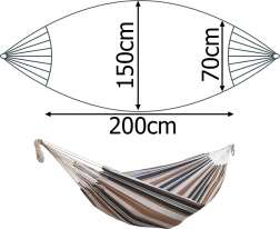 Široka ležeća površina 200 × 150 cm pruža udobnost za jednu ili dvije osobe. Gusto tkane ovjesne užadi ravnomjerno raspoređuju težinu za stabilno i sigurno njihanje. Prozračna tkanina ugodna je na dodir i lako se održava – može se prati u perilici rublja.