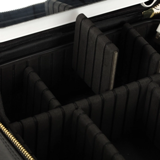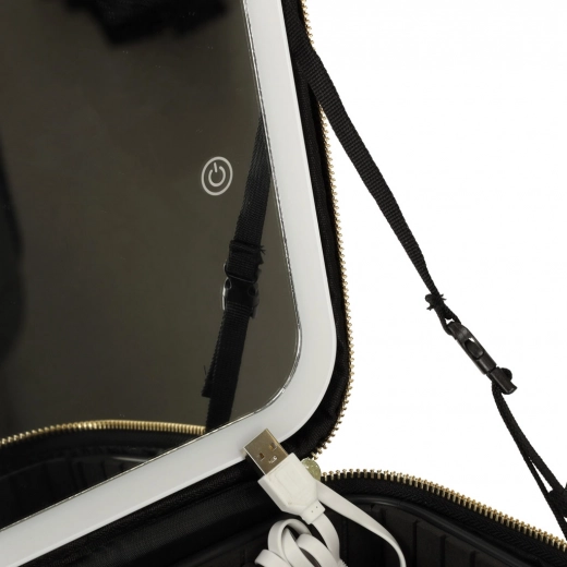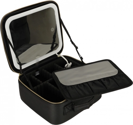 Elegantna crna kozmetička torbica održava vašu opremu savršeno preglednom kod kuće i na putovanjima. Unutra ćete pronaći podesive pregrade, džep za kistove ili ruževe i izdržljivu podstavu koja štiti sadržaj. Ugrađeno LED zrcalo s tri načina osvjetljenja i dodirnim senzorom osigurava precizno šminkanje bilo gdje.