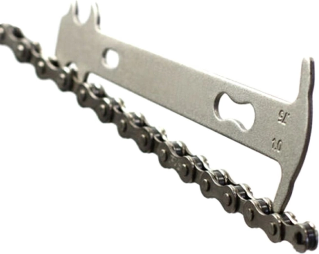 Kompaktan alat za provjeru stanja lanca bicikla. Vrlo jednostavan za uporabu – jednostavno umetnite zaobljeni kraj mjerila u kariku lanca, a drugi kraj naslonite na zategnuti lanac. Mjerilo prikazuje stupanj istrošenosti na skalama 75% i 100%. Ako se kraj mjerila ne može umetnuti između karika, to znači da je lanac u savršenom stanju.