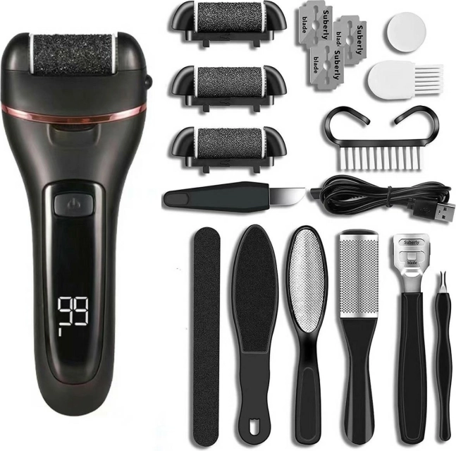 Električna rašpa za pete, idealna za uklanjanje pretjerano zadebljale kože s stopala. Opremljena je ugrađenom baterijom, LED svjetlom i čitljivim LCD zaslonom, koji značajno olakšavaju upotrebu. Njezina vitka i kompaktna konstrukcija osigurava čvrst hvat pri radu bez zamora ruku. U pakiranju se nalaze 3 glave s različitom granulacijom (2 grubozrnate i 1 fina) te niz dodatnih dodataka kao što su četkice i turpije za precizniju njegu.