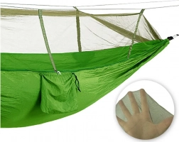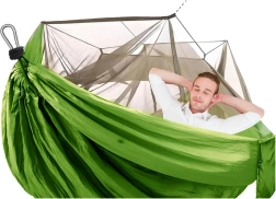 Paket sadrži sve potrebno za brzu instalaciju – čvrste karabinere, izdržljive užadi za pričvršćivanje na stabla i užad za napinjanje moskitijere. Integrirani džep služi za sitnice, a ujedno i kao navlaka za lako pakiranje. S nosivošću do 150 kg i dimenzijama 250 × 140 cm pruža udobnost za jednu do dvije osobe.