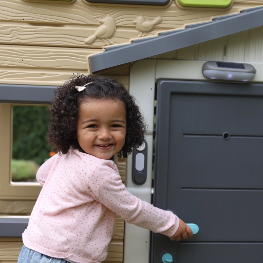 Ugradnja je brza i jednostavna a zvono je kompatibilno s aktualnim vrtnim kućicama SMOBY: Jolie, Lovely, Nature, Pretty, Neo Jura Lodge, Friends House, Friends House Evo, 4 Seasons Playhouse, Sweety Corner Playhouse, Garden House Playhouse, Chef House Playhouse, Kućica na stupovima. Dovoljno je dodati 2× AAA/LR03 baterije (nisu uključene) i zabava može početi.