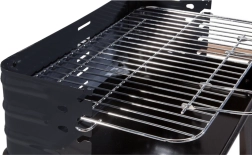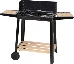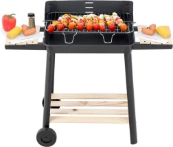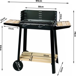 Roštilj je opremljen podesivom rešetkom na pet razina za savršenu kontrolu temperature. Praktična drvena polica pruža dovoljno prostora za odlaganje hrane i začina. Zahvaljujući dvama kotačima, roštilj je lako premjestiv, što povećava njegovu fleksibilnost.