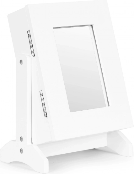 Elegantna kutija za nakit sa zrcalom marke ModernHome nudi kompaktno i stilsko rješenje za pohranu nakita. Unutrašnjost ima crni plišani završetak, mnogo kukica, džep i mjesta za lančiće, prstenje, narukvice i naušnice. Stabilna konstrukcija i praktično zrcalo na vratima olakšavaju odabir modnih dodataka i šminkanje.