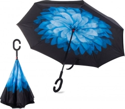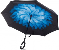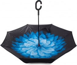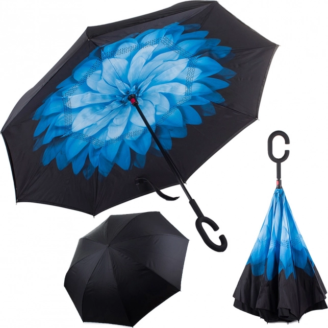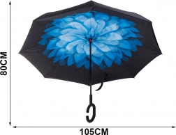 Praktičan obrnuti kišobran s C drškom nudi konstrukciju koja ne kaplje, dvoslojni materijal i čvrste skrivene žice za veću otpornost na vjetar. Vanjska strana je crna, a iznutra se ističe stilizirani plavi cvijet koji popravlja raspoloženje i po kiši.