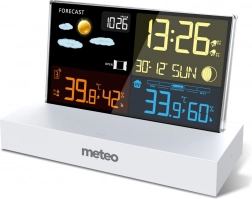 Pametna meteorološka stanica METEO s preciznom prognozom vremena, barometrom, mjerenjem temperature i vlažnosti u zatvorenom i na otvorenom te DCF satom za automatsko podešavanje vremena. U boji zaslon je odlično čitljiv, a tu su i mjesečeve mijene, indeks udobnosti te alarm temperature. U paketu je bežični senzor s dometom do 60 m i mrežni adapter.