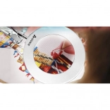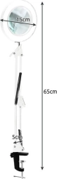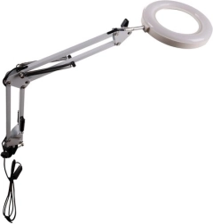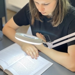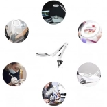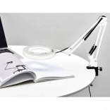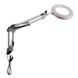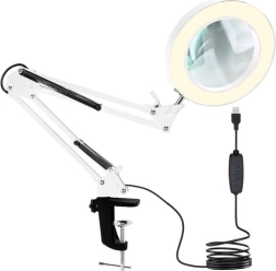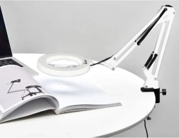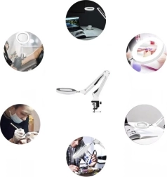 Praktična stolna svjetiljka s povećalom i kružnim LED osvjetljenjem za precizan rad u kozmetici, manikuri, obrtima i elektronici. Nudi 3 boje svjetla (topla, neutralna, hladna), 10 razina svjetline, stabilnu metalnu ruku s oprugama i stezni držač za rub stola. Staklena leća 3× povećanja pruža oštru sliku bez izobličenja. Napajanje putem USB-a s upravljačem na kabelu.