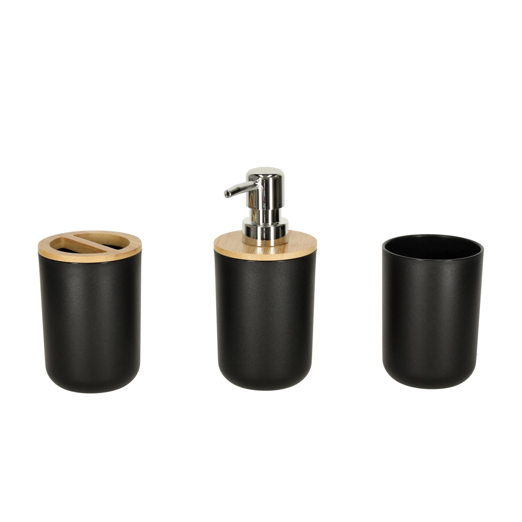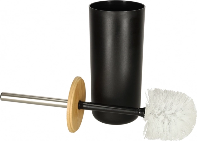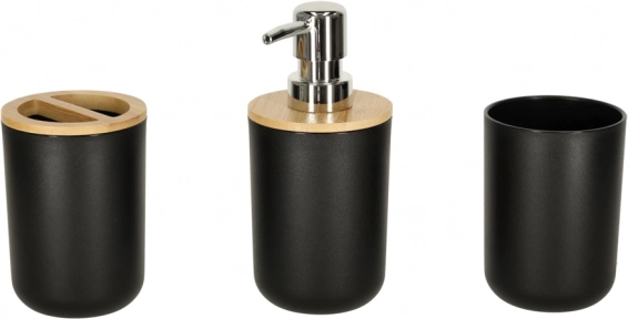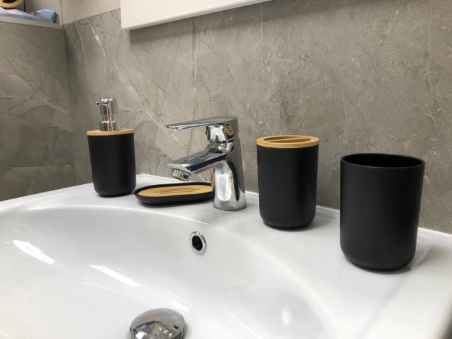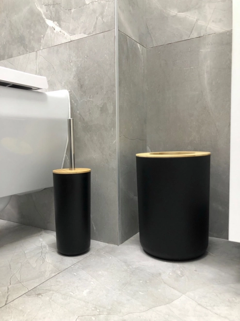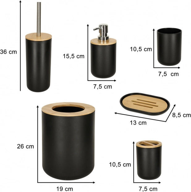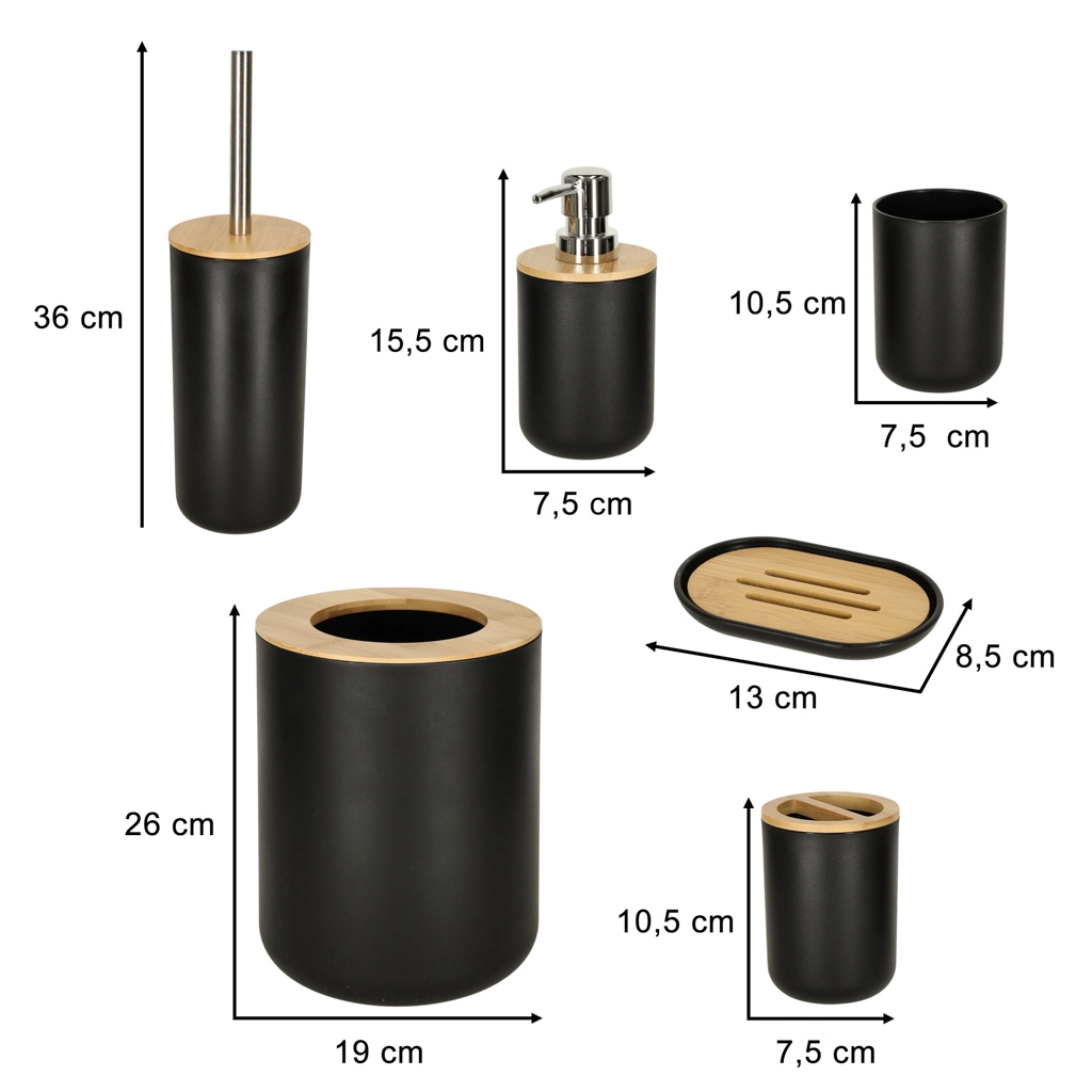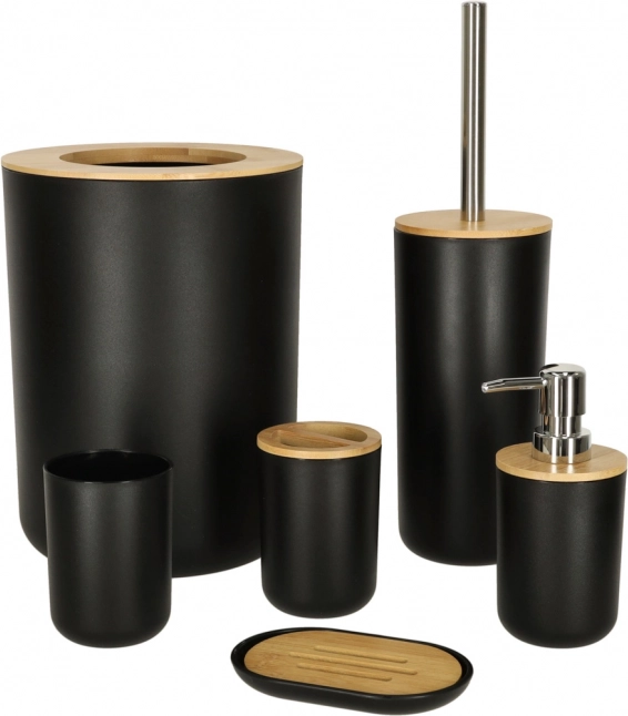 Elegantni 6-dijelni set kupaonskih dodataka u crnoj boji s drvenim akcentima ujednačit će izgled vaše kupaonice i olakšati organizaciju. Sadrži koš, WC četku s kućištem, dozator sapuna, čašu, čašu za četkice i posudicu za sapun. Kombinacija izdržljive plastike i drva osigurava dug vijek trajanja, moderan dizajn i jednostavno održavanje.
