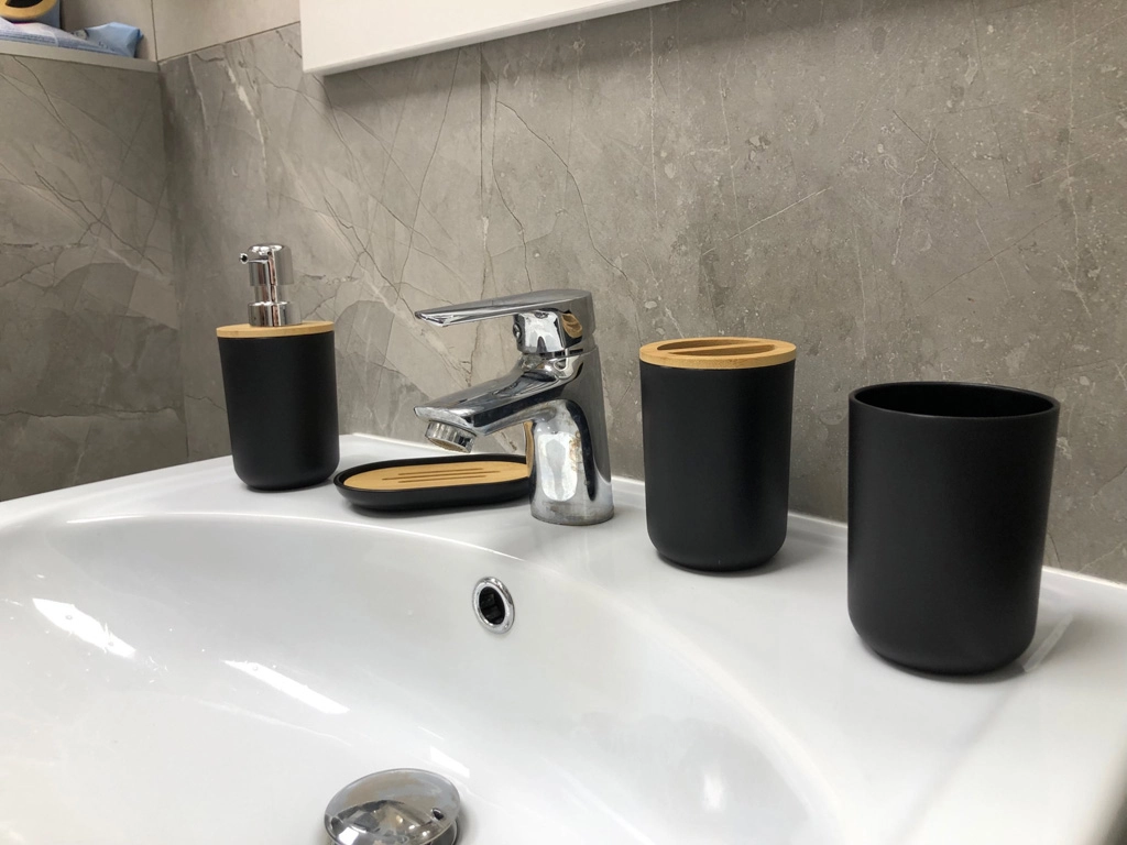 - Kompletna oprema: dozator sapuna, držač za četkice, čaša, posudica za sapun, WC četka s posudom, koš za otpad